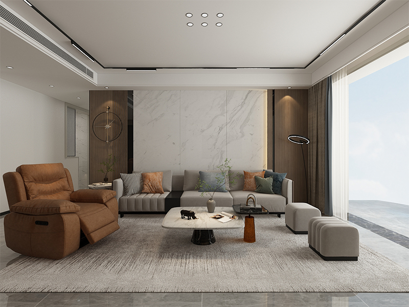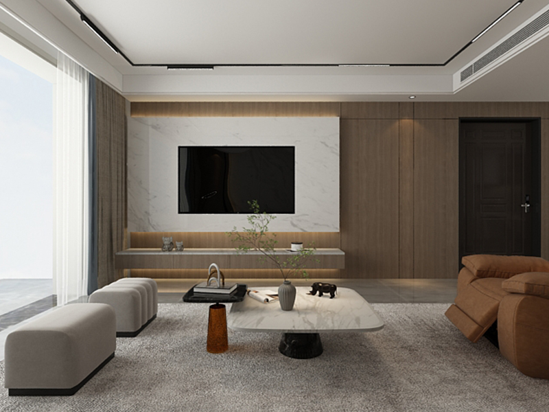 ??濟(jì)南阿達(dá)森裝飾為穎秀華府打造的現(xiàn)代極簡輕奢風(fēng)。淺米色大尺寸沙發(fā)柔化空間,搭配焦糖棕單人椅,用撞色拉出層次感;黑白紋理茶幾與同質(zhì)感背景墻呼應(yīng),高級又利落。深色木飾面 +